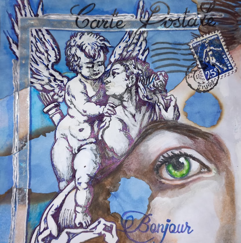 No dejo de maravillarme cada año del cuidado y el cariño que pone el equipo de trabajo encargado de la curaduría de la Twitter Art Exhibit. En esta edición, en Toronto - Canadá, la curadora Kelly Kitson (@ArtbyKellyK) presenta cada pequeña postal que recibe con una cuidadosa fotografía en un entorno único que resalta la estética de la obra. En el caso de Rue Papillon la acompañó con una estilizada flor naranja que imagino no le fue fácil conseguir. Me parece fascinante el resultado poético que logró y es inevitable sentirse -como autora de la postal- realmente apreciada, una sensación muy grata que no es habitual que los artistas sintamos cuando aportamos nuestro trabajo.