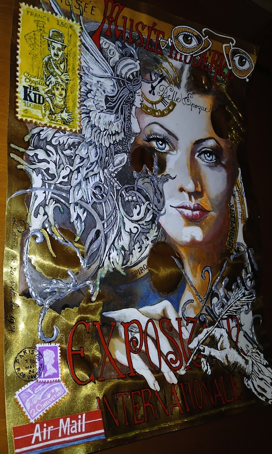 Después me consiento volviendo a mi era de confort, los principios del siglo 20, agregando unas letras ornamentadas y neoyorkinas. Después més texto, dimensionador y suficiente dorado.